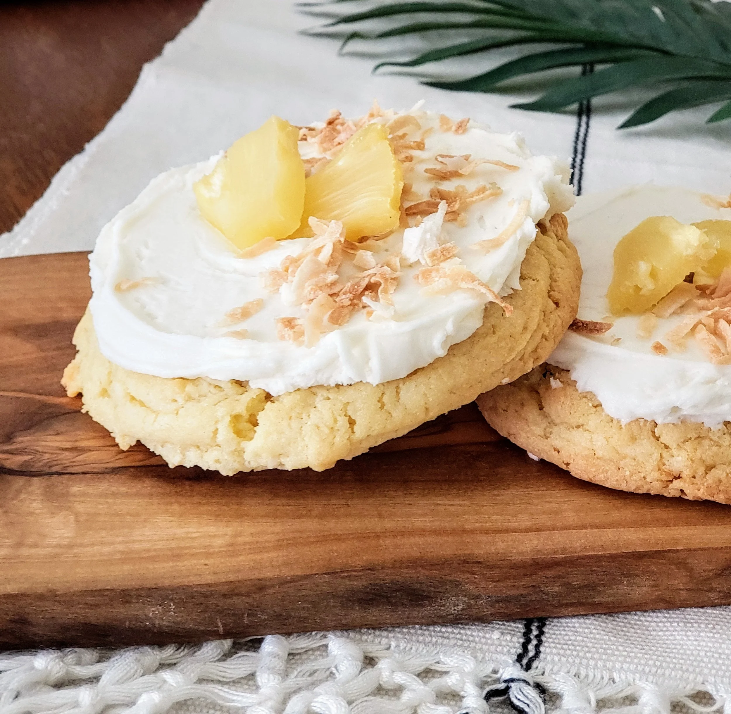 It’s back, baby! This sweet pineapple cookie comes topped with a whipped coconut cream frosting, toasted coconut, and pineapple pieces. Hello, Summer!